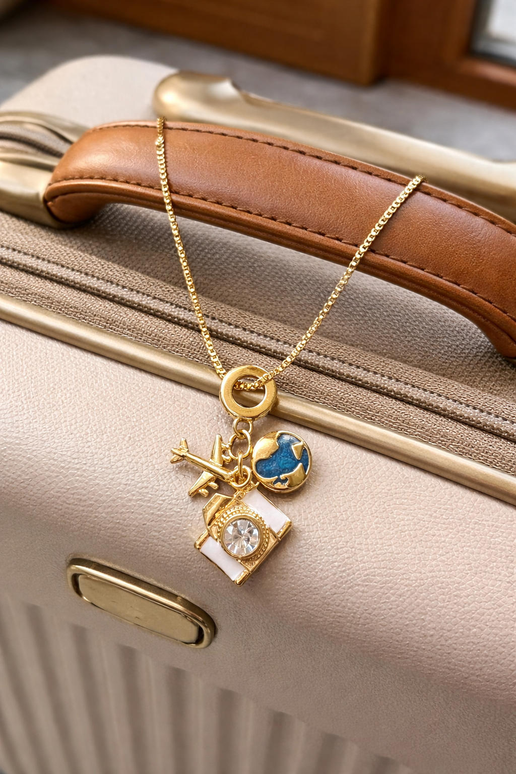 Collar enchapado en oro con pendientes de un avión, cámara y el mundo.